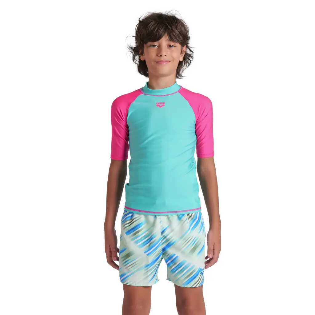 Η μπλούζα αντιηλιακής προστασίας με κοντά μανίκια arena Graphic UV για κορίτσια και αγόρια είναι ιδανική για κολύμβηση και άλλες δραστηριότητες στην πισίνα, στην παραλία και στον ήλιο. Προσφέρει προστασία UPF 40+ και είναι φτιαγμένη από μαλακό ύφασμα που στεγνώνει γρήγορα για εξαιρετική άνεση. Η πιστοποίηση OEKO-TEX® STANDARD 100 του υφάσματος σημαίνει ότι έχει ελεγχθεί για επιβλαβείς ουσίες, εξασφαλίζοντας ότι είναι αβλαβής για την ανθρώπινη υγεία και το περιβάλλον.
