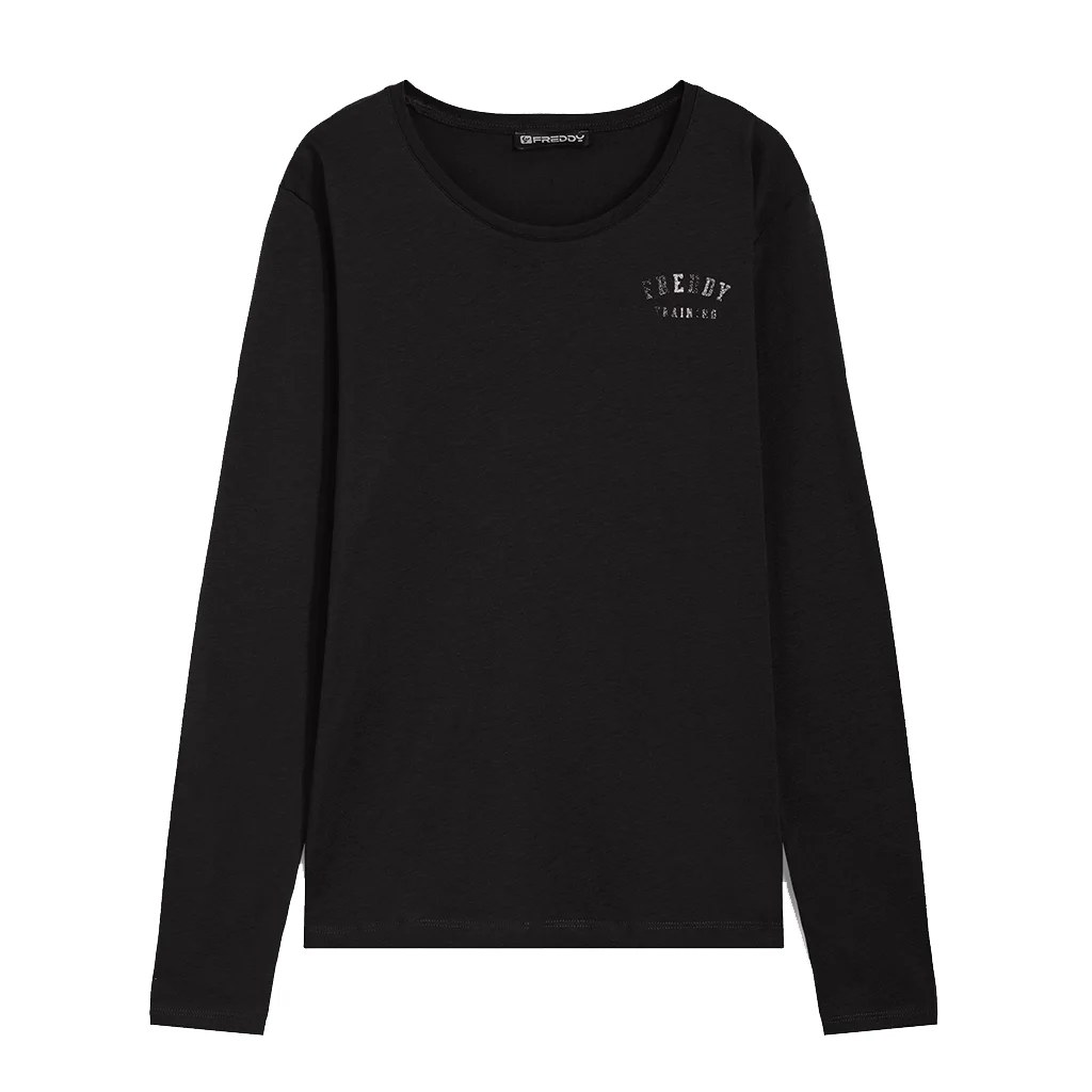 Regular-fit long-sleeve t-shirt decorated with a small FREDDY TRAINING collegiate print in silver glitter over the heart. It has a round neckline, regular long sleeves and a straight hemline. The relaxed design combines with the natural flexibility of the cotton jersey fabric to accentuate the fantastic comfort and freedom of movement offered for sports practice and active lifestyles.