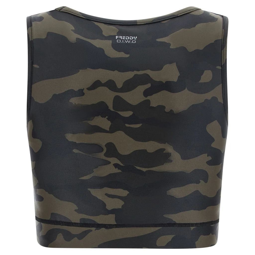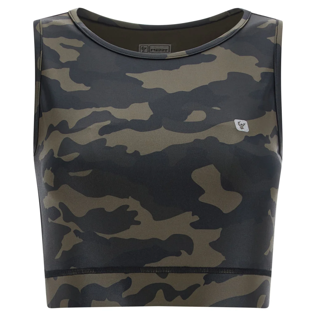 Αθλητική μπλούζα με στρατιωτικό μοτίβο (τύπου στολής παραλλαγής) με καλά αεριζόμενο, φιλικό προς το περιβάλλον, πατενταρισμένο ύφασμα υψηλής απόδοσης D.I.W.O.®. Πρόκειται για ένα υλικό κατασκευασμένο από ανακυκλωμένα πλαστικά μπουκάλια. Το ύφασμα έχει διάφανη επίστρωση, που δημιουργεί ένα ιδιαίτερο αποτέλεσμα στο ρούχο, που έχει μια ελαφριά γυαλάδα με γκλίτερ.
