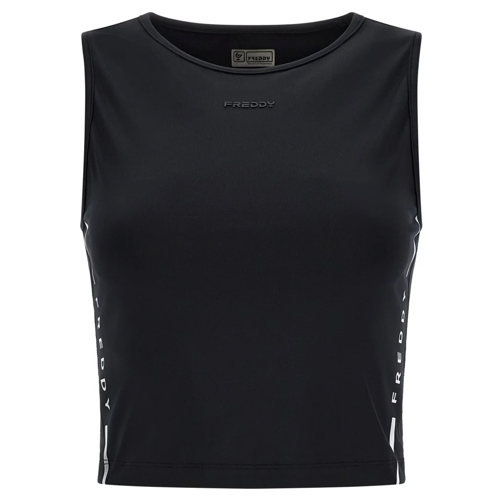 Μπλουζάκι cropped από καλά αεριζόμενο, φιλικό προς το περιβάλλον, ύφασμα υψηλών αποδόσεων, διακοσμημένο με μία στάμπα Freddy, που κάνει χρωματική αντίθεση κι είναι τοποθετημένη κάθετα.