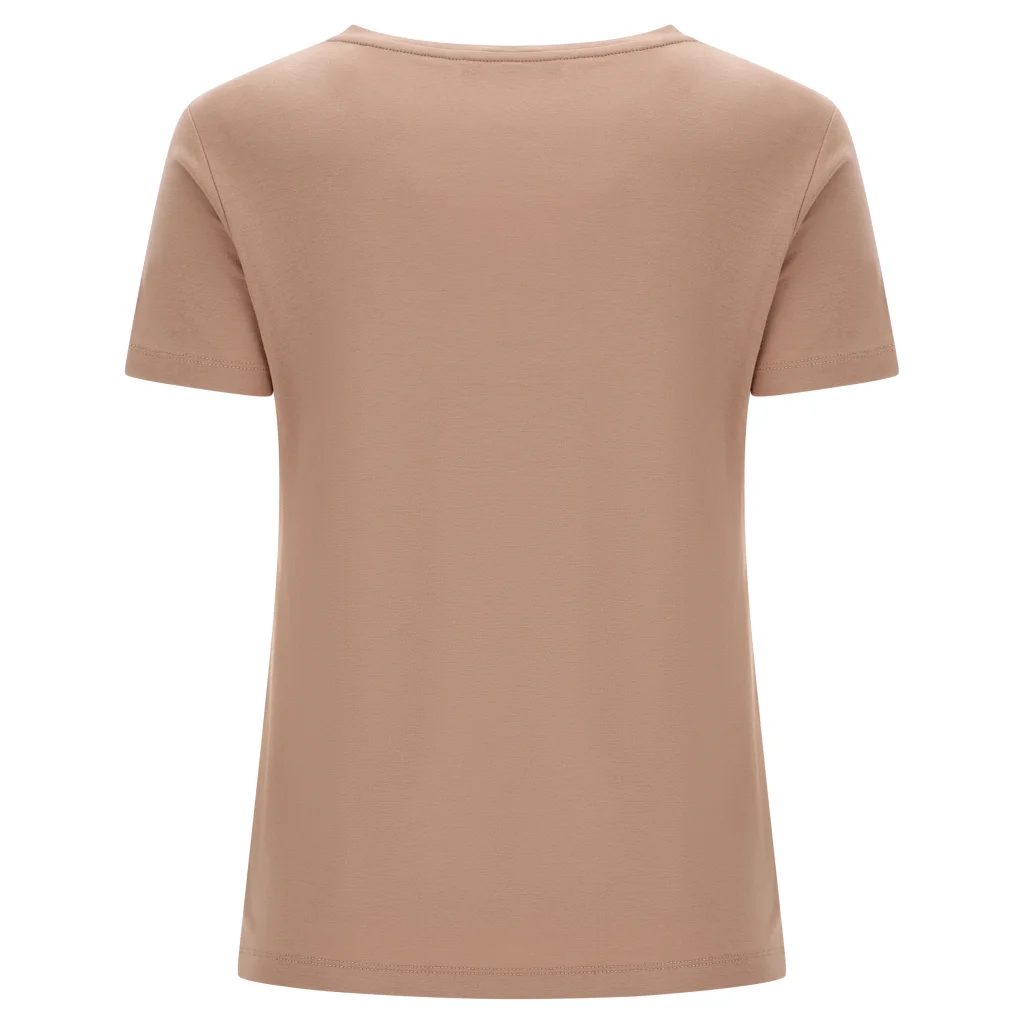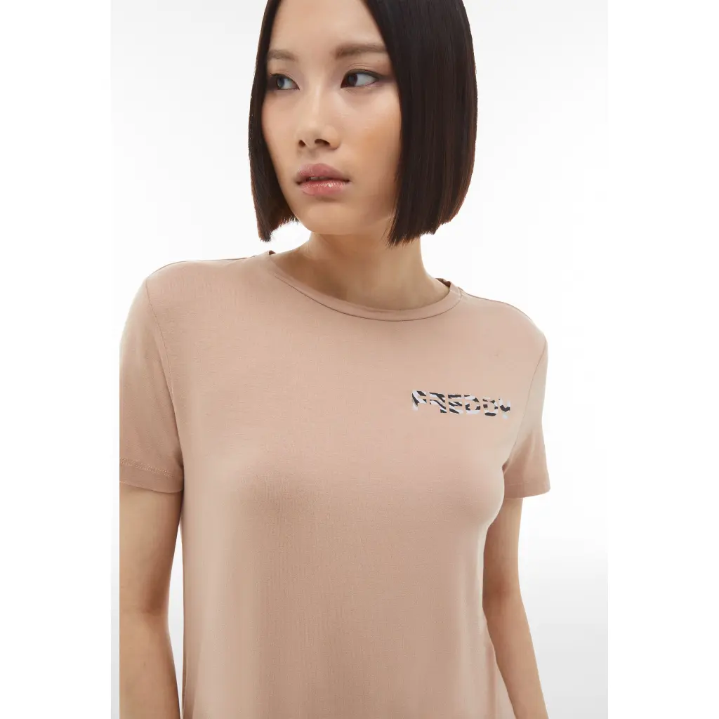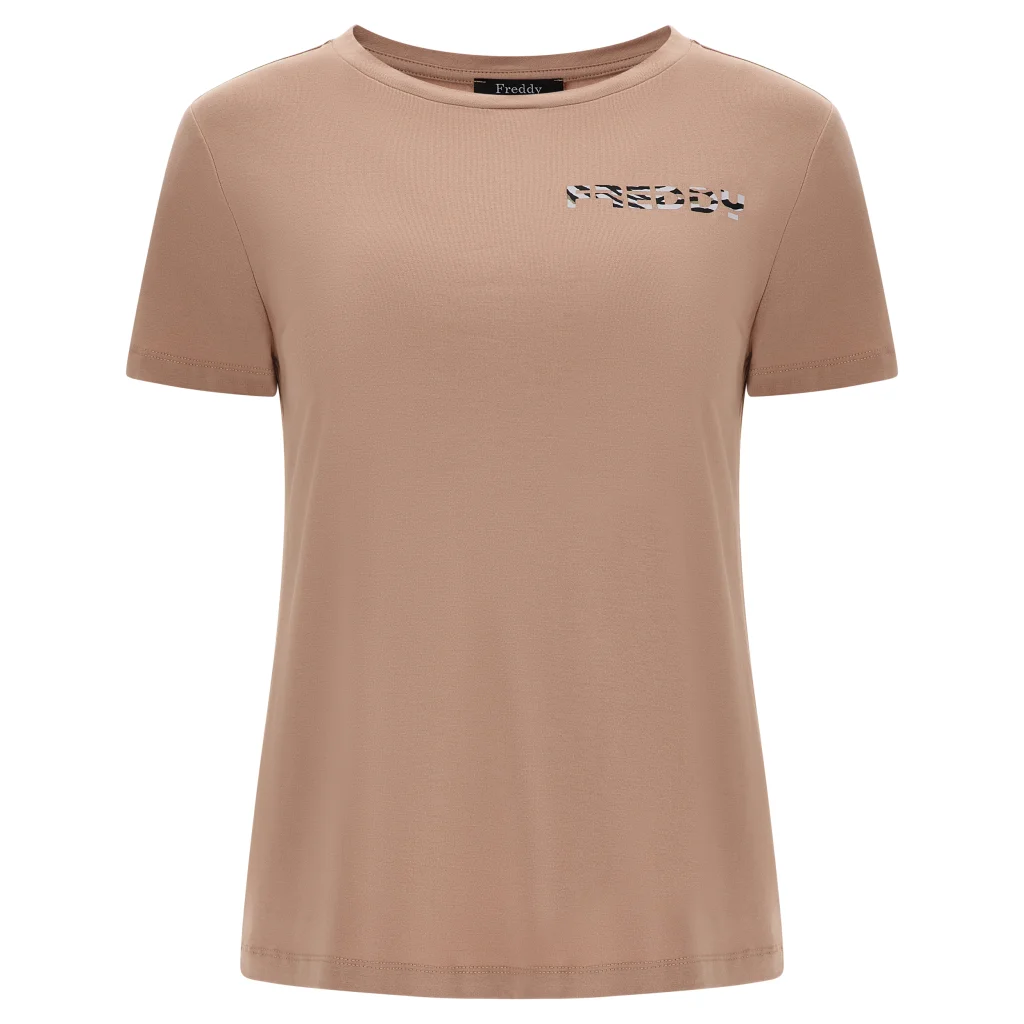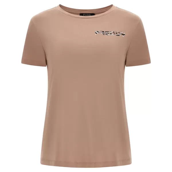 Μπλουζάκι από βισκόζη και πλέξη τύπου ζέρσεϊ` ένα ύφασμα που χαρακτηρίζεται από βελούδινη απαλότητα, ελαστικότητα και φυσική λάμψη, χάρις στο σατινέ φινίρισμα. Έχει κανονική εφαρμογή (ούτε ιδιαίτερα στενό ούτε ιδιαίτερα φαρδύ) και διαθέτει μία στρογγυλή λαιμόκοψη, κοντά μανίκια και ίσιο στρίφωμα. Το λογότυπο με τη λεοπάρ στάμπα πάνω από την καρδιά ολοκληρώνει τις κομψές λεπτομέρειες αυτής της λαμπερής μπλούζας. Είναι αφιερωμένο στην άνεση σε κάθε περίσταση, χάρις στο κόψιμό του και το απαλό σε υφή ύφασμα, που έχει μεγάλη ελαστικότητα.